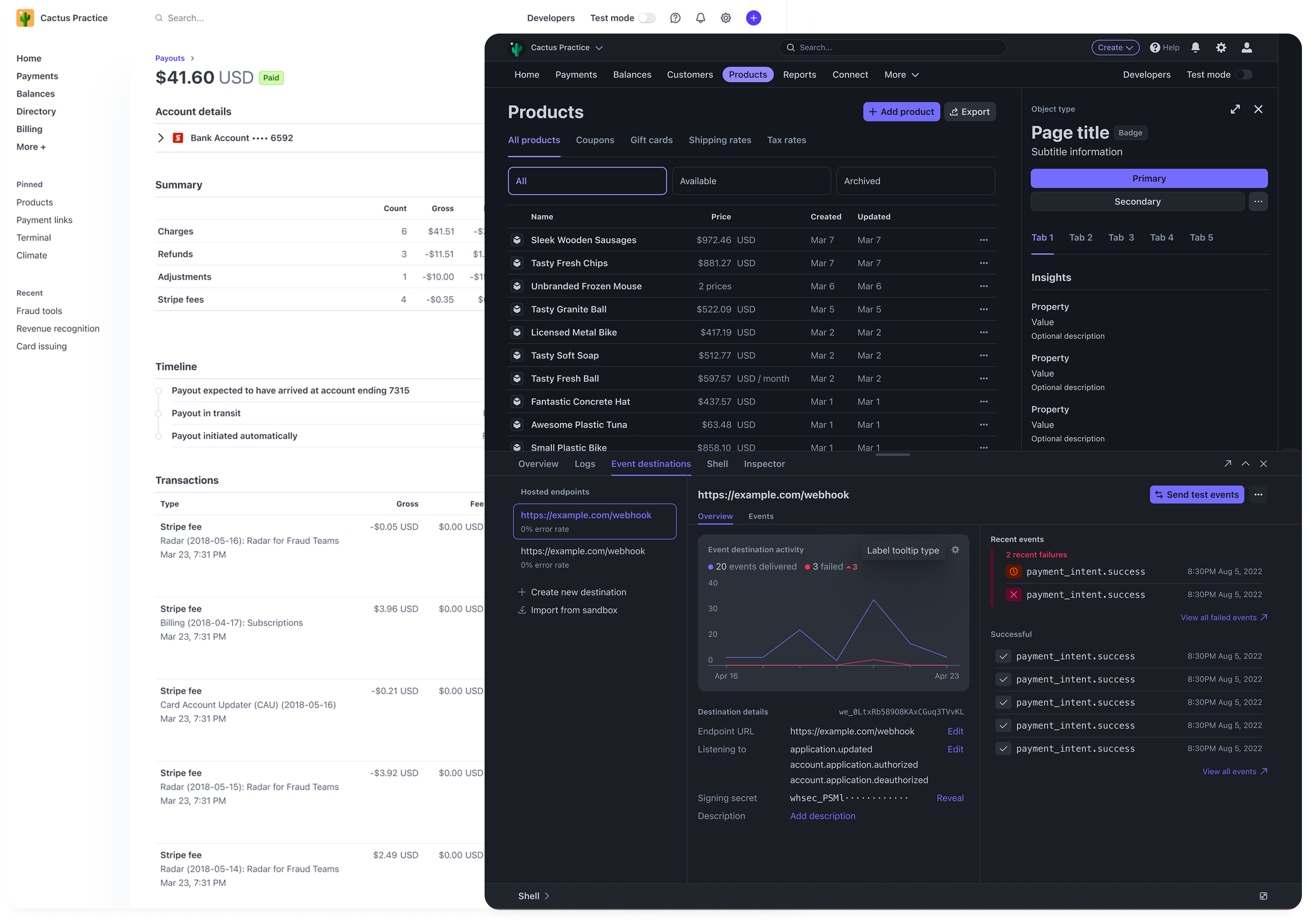 Because we built all of the components to be fully themable, this design system served as a backbone for an external-facing feature called Stripe Embedded Components. Embedded components enabled merchants to seamlessly embed Stripe's dashboard functionality into their own apps, matching it to the look and feel of their product.