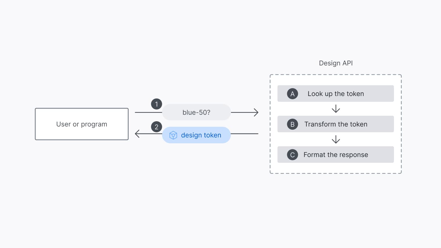 The third process formats the response. Here we can choose to wrap the output token’s (or list of tokens’) value in some extra code to make it easier to incorporate into our own program or use case. For instance: if I’m working on a documentation site that uses SASS, it’d be nice to have the color formatted as a SASS variable ($blue-50: rgb(39, 77, 216)). But if my production app uses CSS custom properties, the formatting should be in vanilla CSS ( :root {--blue-50: rgb(39, 77, 216);). At the moment, my own proof-of-concept can only format the response as JSON - more on that later.