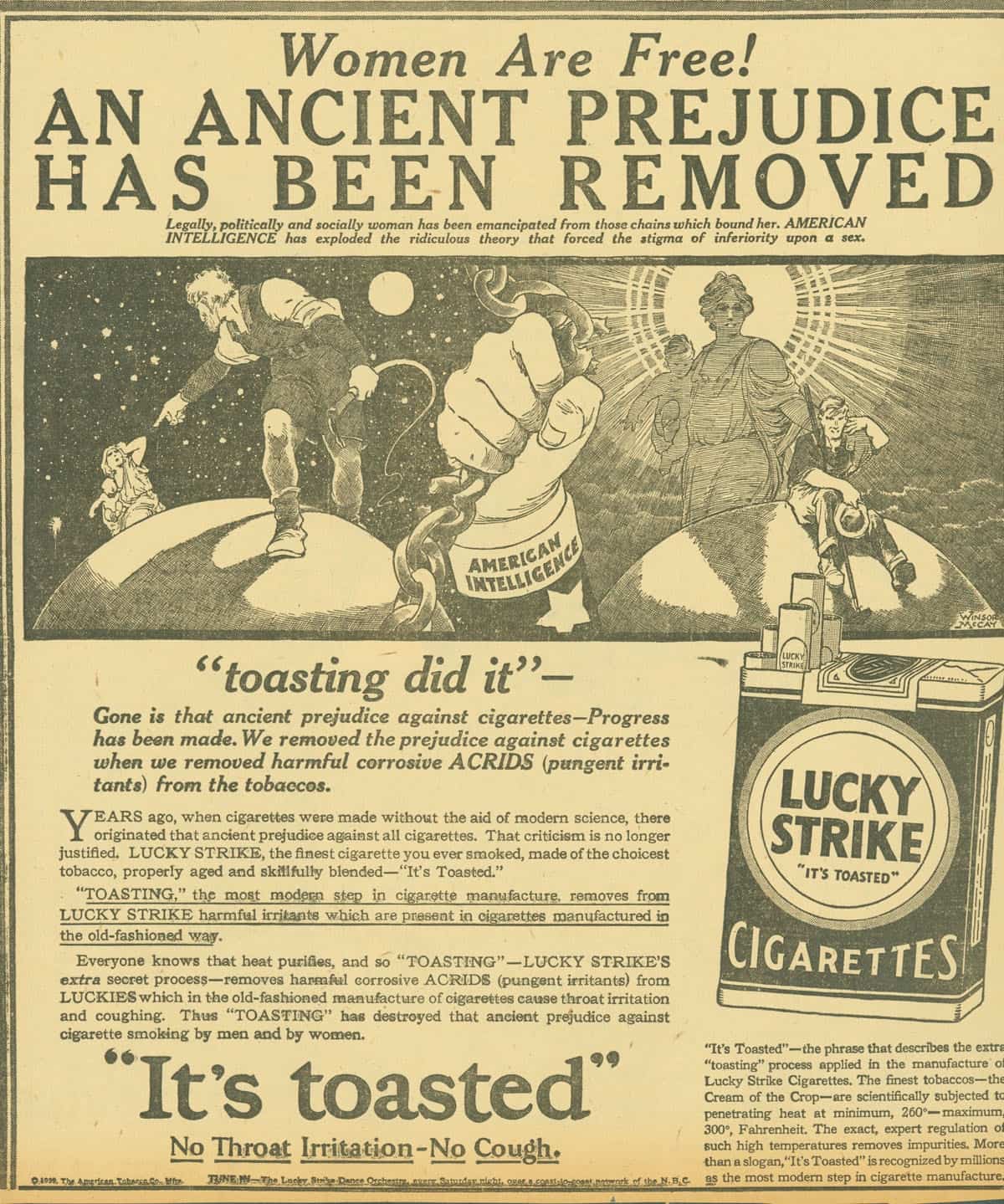 Edward Bernays, called “the father of public relations,” was behind the earliest cigarette ad campaigns targeted at women. Bernays was Sigmund Freud’s nephew and organized the US publication of Freud’s Introductory Lectures on Psychoanalysis in 1920. ↩︎